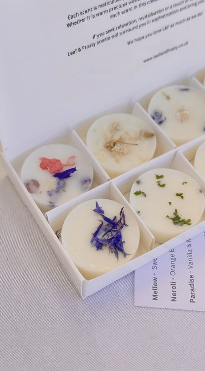 Sample the full L&F scent collection. The Signature Collection Discovery Pack from Leaf and Frosty features 10 meticulously crafted botanical wax melts, each an exquisite blend of luxury coconut soy wax and premium fragrance & essential oils.